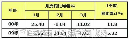 今年一季度,全国GDP增长6.1%,低于2008年全年,啤酒产量增幅亦然。最新行业统计数据显示,一季度全国啤酒产量增幅5.32%,其中3月份负增长4.05%,业界对2009年啤酒行业的乐观预计并没有兑现。(下表为1月—3月与去年同期的对比)