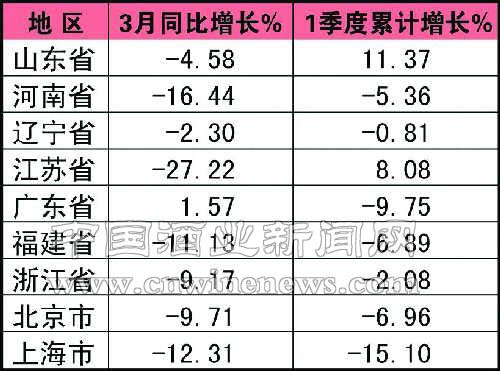全国年产量排名前三的山东、河南、广东省均呈现负增长,同时,河南、广东一季度累计负增长5%以上,而上海、北京也未能幸免,月度及季度累计均呈现大幅下滑。