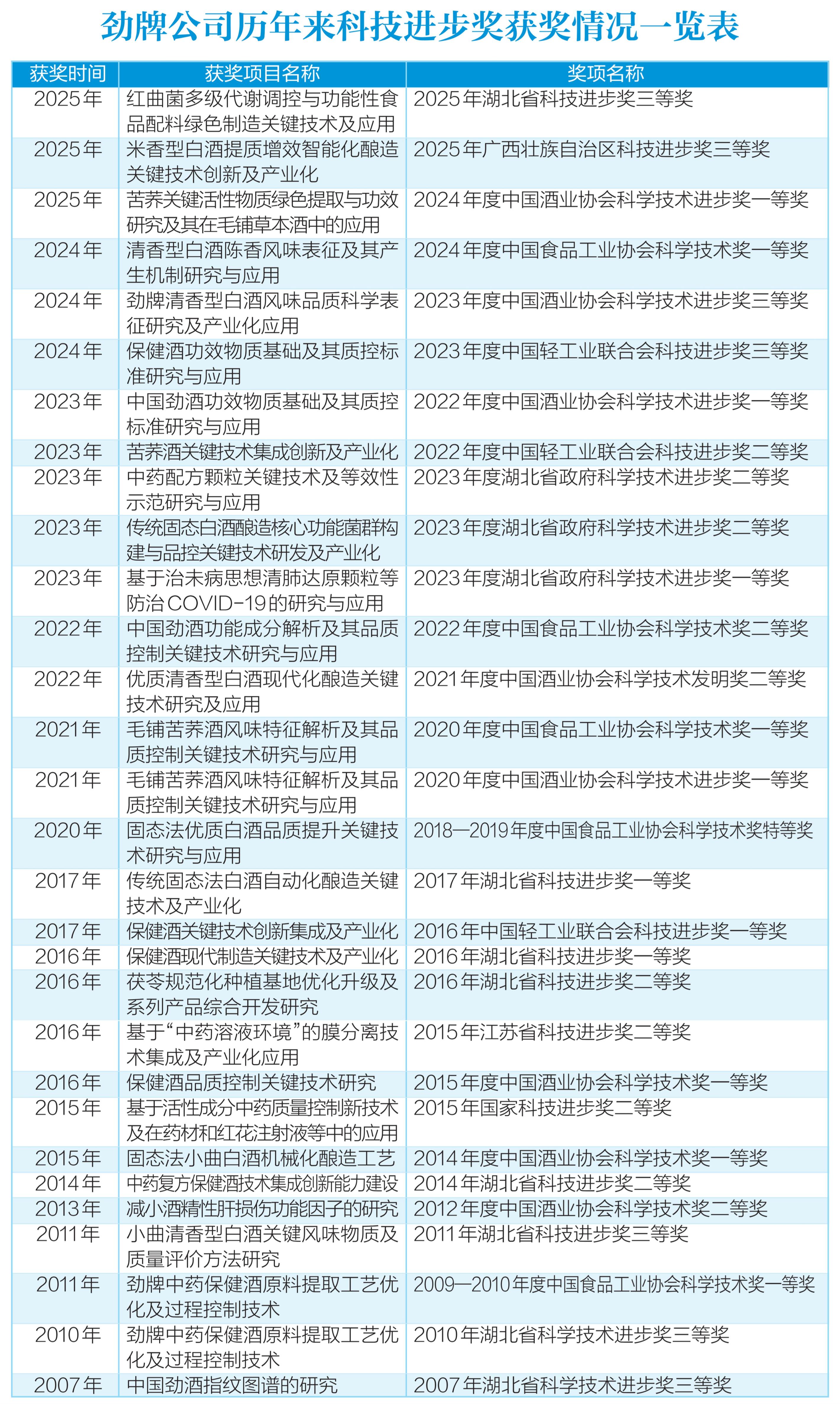 2025年,劲牌科研团队同时开展的科研项目近百项,形成了“从应用驱动研究、从研究促进应用”的优化体系,并取得多项成果:截至2025年12月,公司累计获得授权专利266项,其中发明专利144项;另有成果分别获得中国酒业协会科学技术进步奖一等奖、中国食品工业协会科学技术进步奖二等奖和湖北省科技进步奖三等奖。