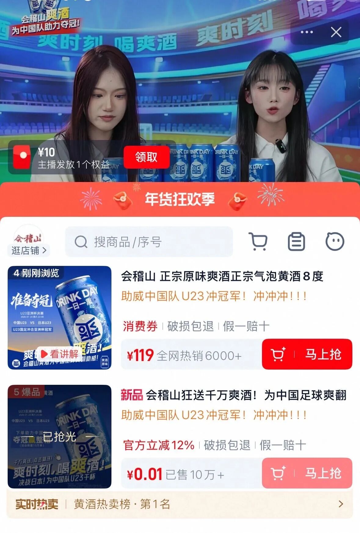 赛事转播期间会稽山爽酒直播间截图